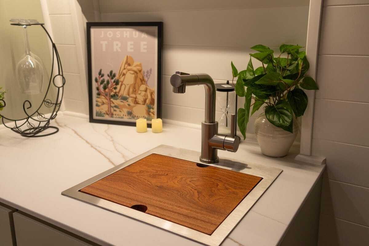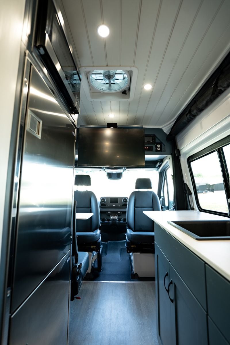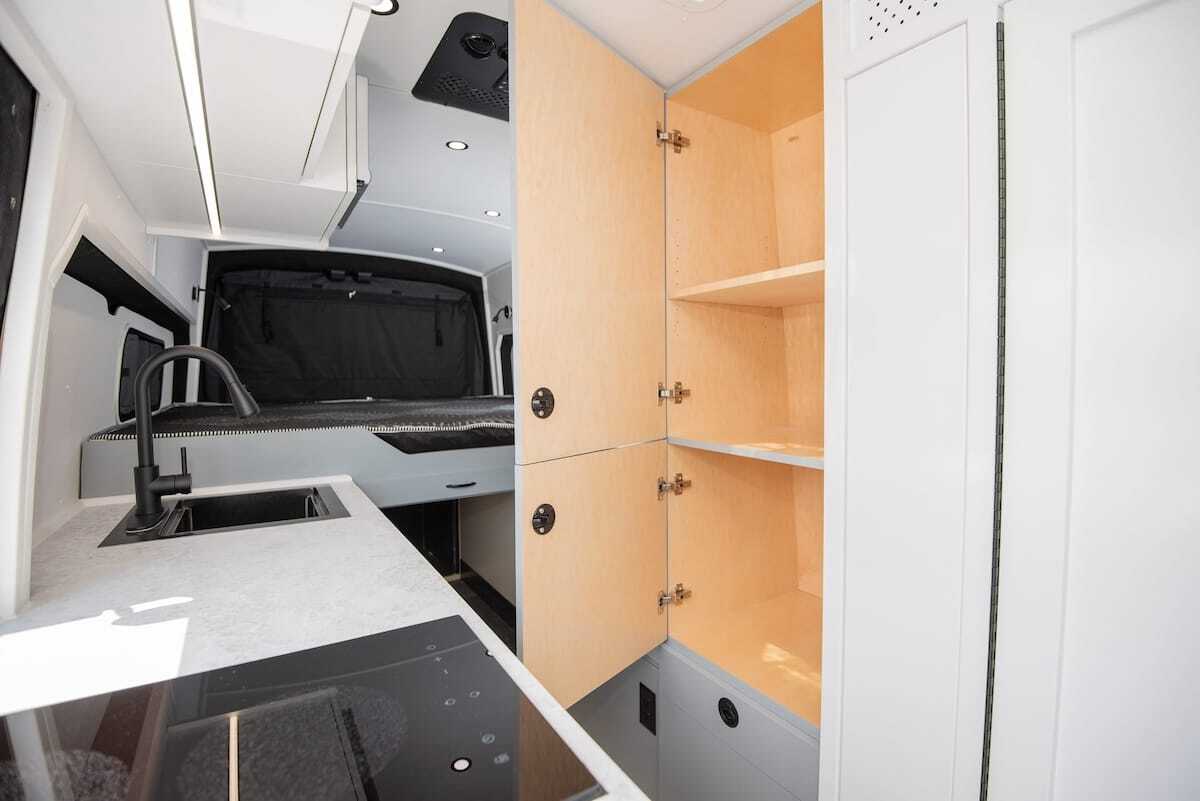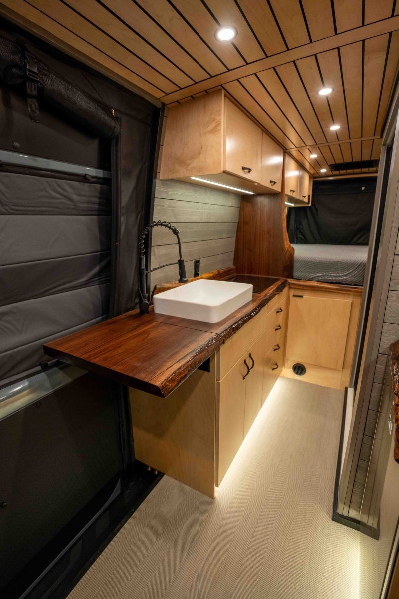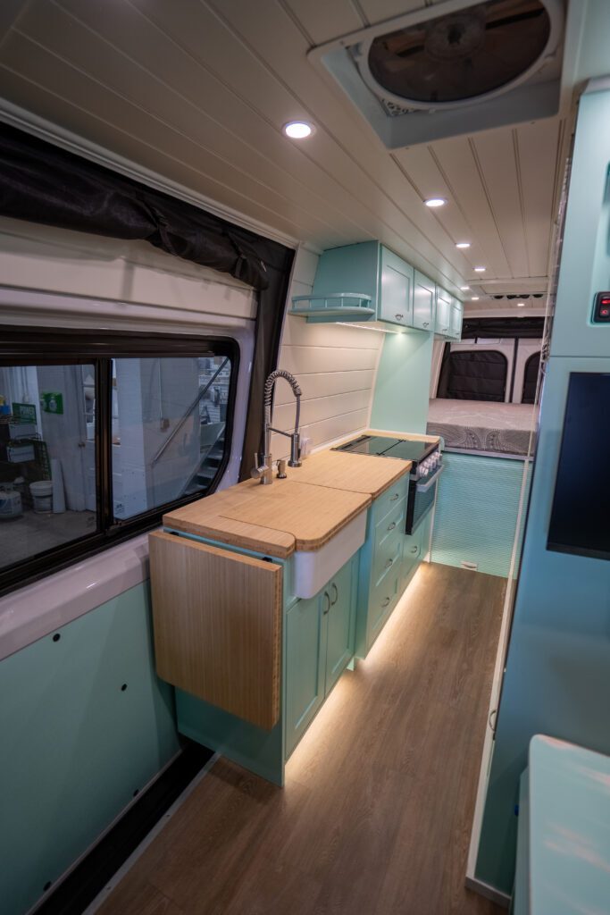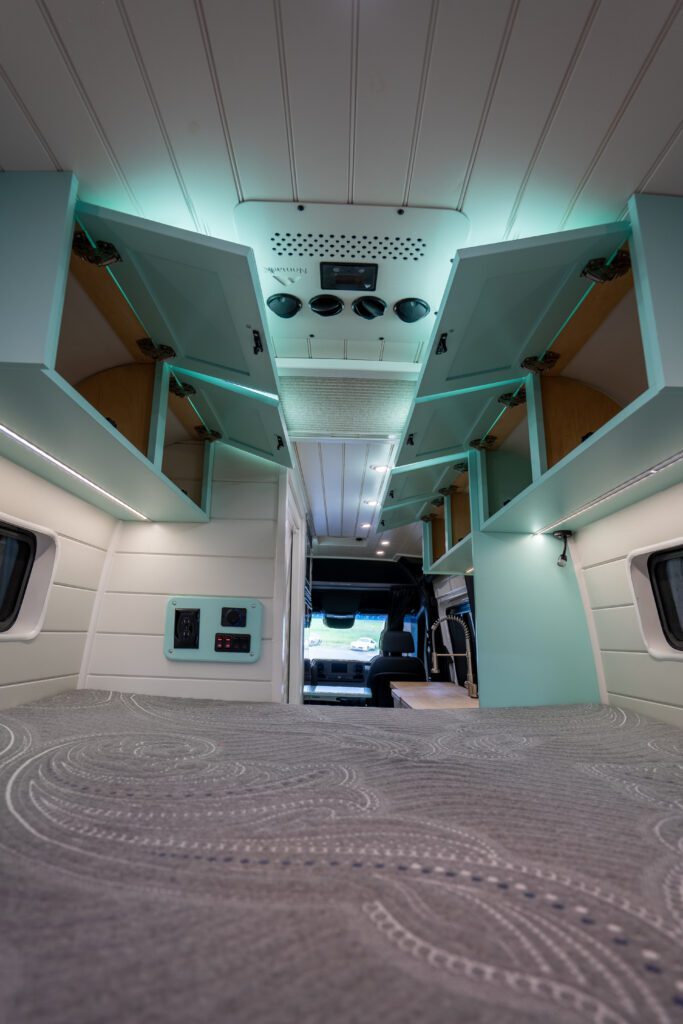 The owners wanted the sliding door area to remain open and accessible, perfect for hanging a hammock in the doorway! To make this vision come to life, we reworked the design to maximize living space, adding Flare Spaces (bump-outs) so the travelers could sleep east-west, creating even more room for comfort and convenience.