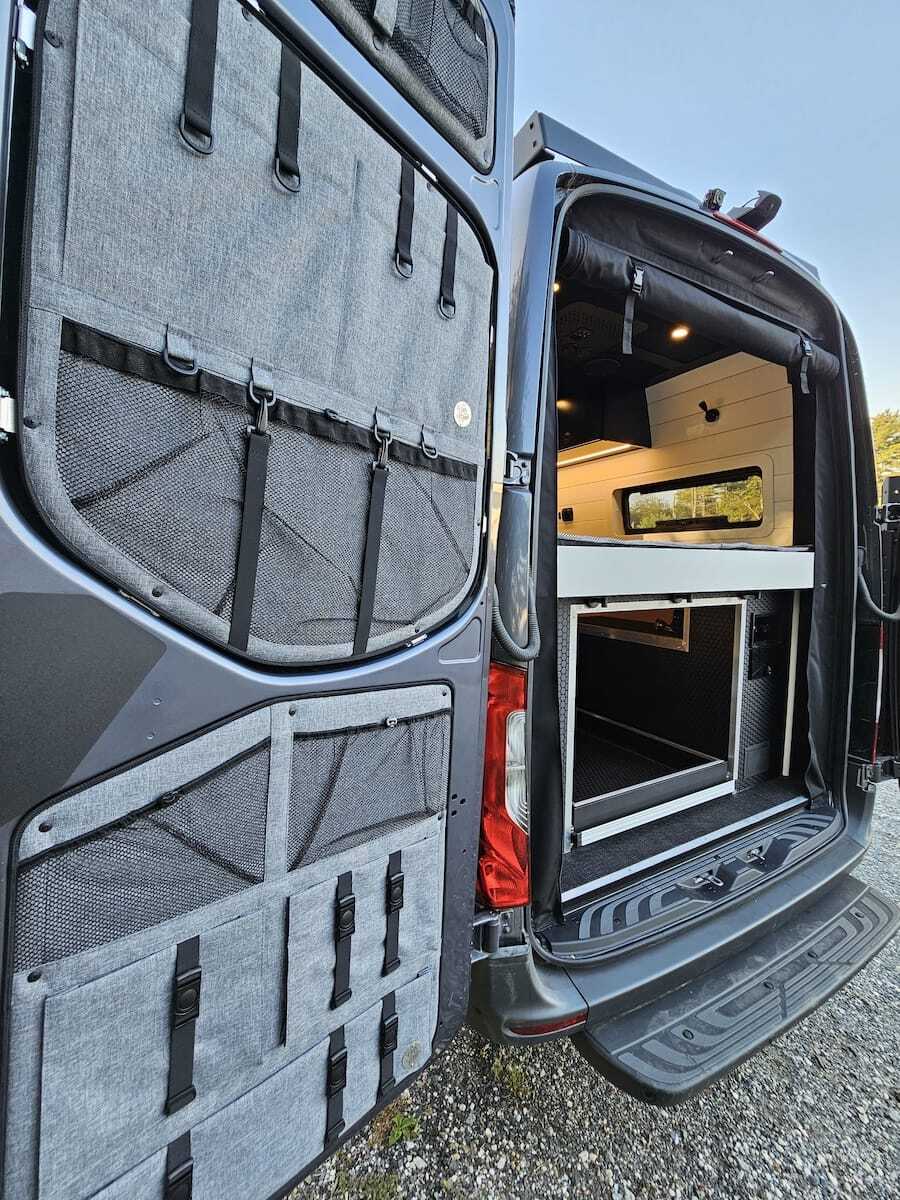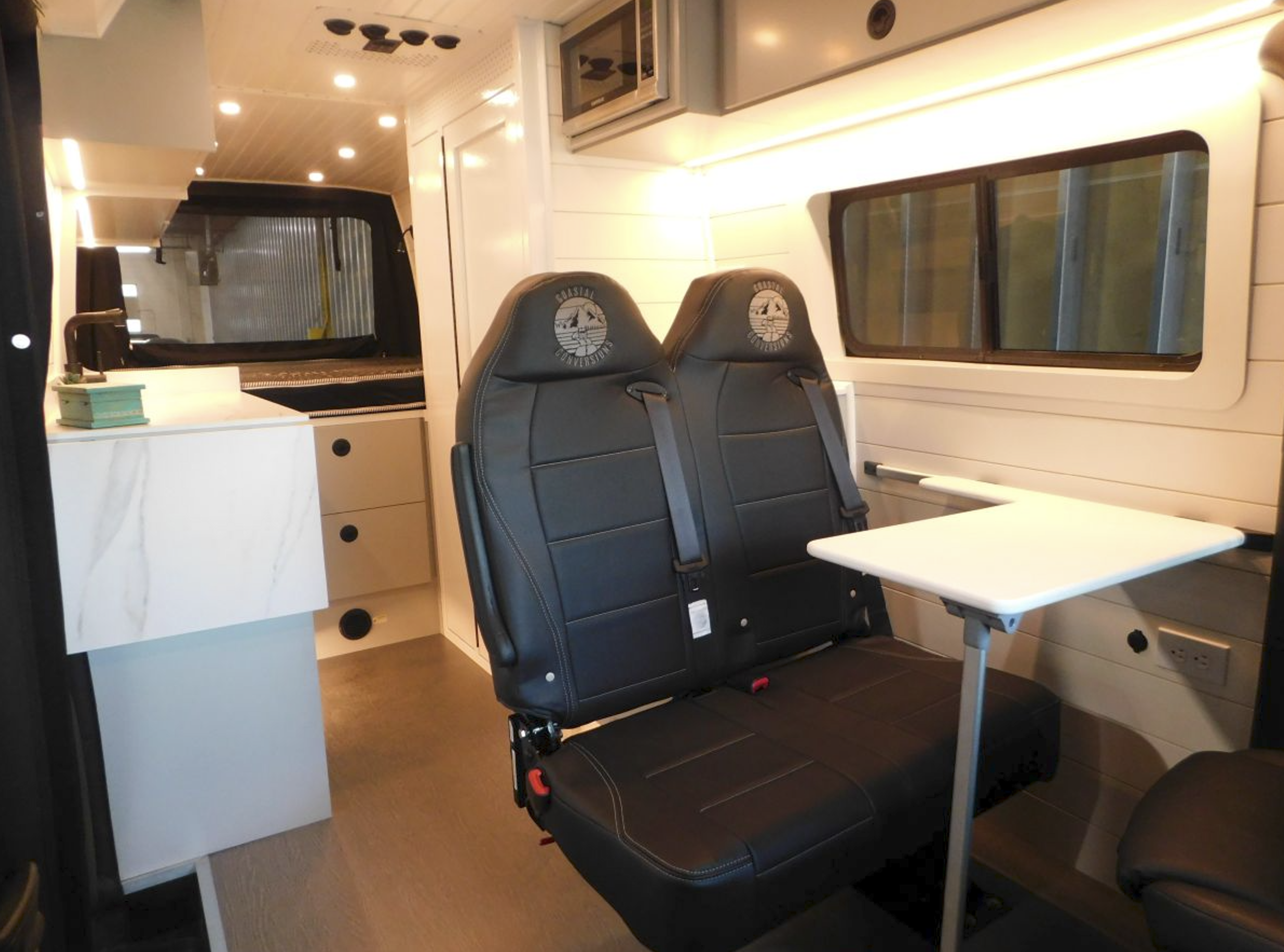 On the passenger side, a large galley features a custom-made sink cover, while the driver’s side houses a custom shower, an adjacent cabinet, and a fold-down two-person bench for easy seating. With two removable tables and swivel seats, the interior offers flexibility for remote work or a fun game of cards, surrounded by the great outdoors. The EcoFlow electronics, the custom rear slide-out tray, and the slide-out dining table are housed in the garage—perfect for outdoor picnics!